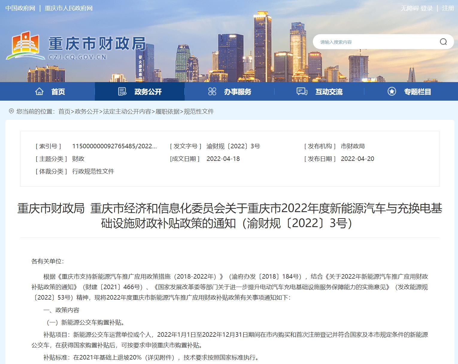 2022年04月20日重庆市财政局 重庆市经济和信息化委员会发布了:关于重庆市2022年度新能源汽车与充换电基础设施财政补贴政策的通知(渝财规〔2022〕3号),称将针对新能源新能源公交车购置、充电桩建设、换电站建设、营造推广氛围四方面进行补贴。