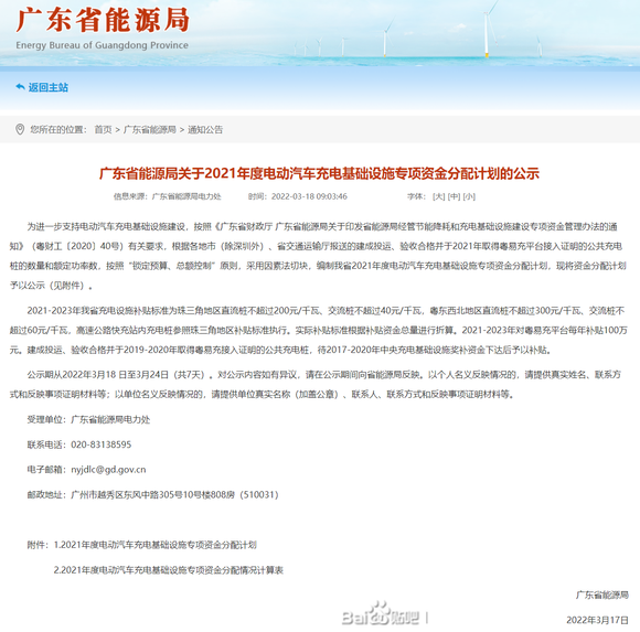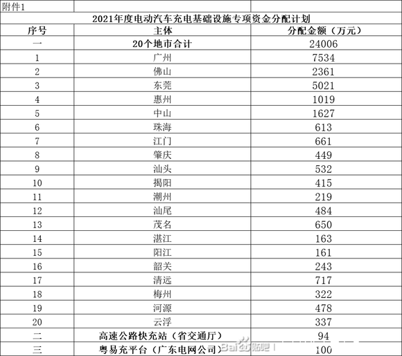 2.4亿!广东2021年电动汽车充电设施资金补贴计划公示今发表时间:2022-03-25 18:31 重点提示:3月18日,广东能源局公示关于2021年度电动汽车充电基础设施专项资金分配计划。附件显示,共有20地市安排资金超2.4亿元,标准以验收合格并于2021年取得粤易充平台接入证明直流充电桩13279台,交流充电桩4313台。(来源:广东省能源局,广东国恒充电桩编辑整理。如有侵权请联系删除。) 惠州市国恒充电桩有限公司主要经营:国标新能源汽车充电桩、交流充电桩、直流充电桩、充电站、换电站、充电设备、充电系统设施设备产品的技术、研发、销售、运营、租赁、管理、安装施工工程、维护服务;充电桩运营、充电站运营、停车场经营;新能源汽车和电瓶车充电服务、移动充电服务;新能源汽车的销售、租赁服务;软件开发及销售;机电设备安装工程、光伏设备安装工程;电力工程设计及技术咨询服务;电力工程设备、环网柜、配电箱、高低压成套设备、箱式变电站、变压器、通讯设备的研发销售;膜结构工程、钢结构工程、停车棚、光伏车棚、光储充一体化工程产品技术研发及应用、销售、安装施工服务。公司定位做高性价比、靠谱的充电桩设备一站式服务厂家www.ghcdz.cn。欢迎来洽或致电咨询张经理18026522512 。